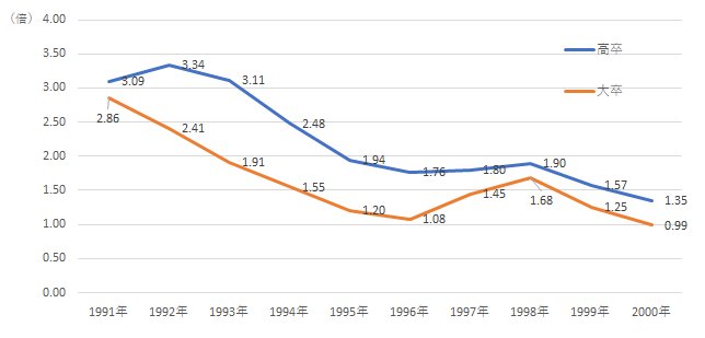 [図表1]新卒者に対する求人倍率:1991~2000年