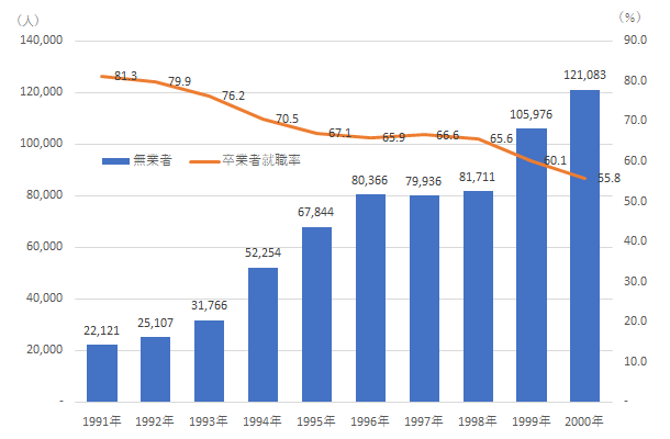 [図表2]大卒者の就職率・新卒無業者数の推移:1991~2000年
